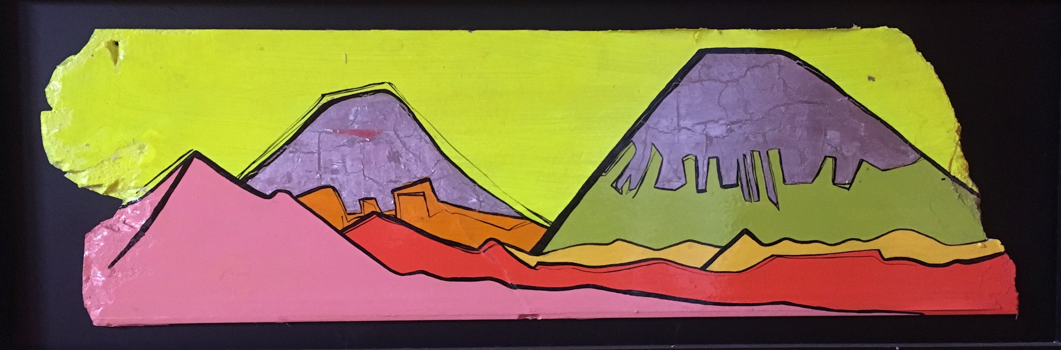 acrílico, foil y barniz sobre material recuperado (tablaroca), 38 x 137 cm, 2017.